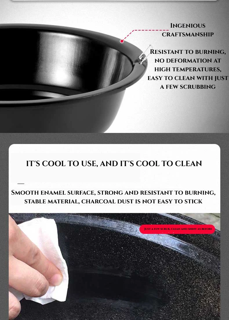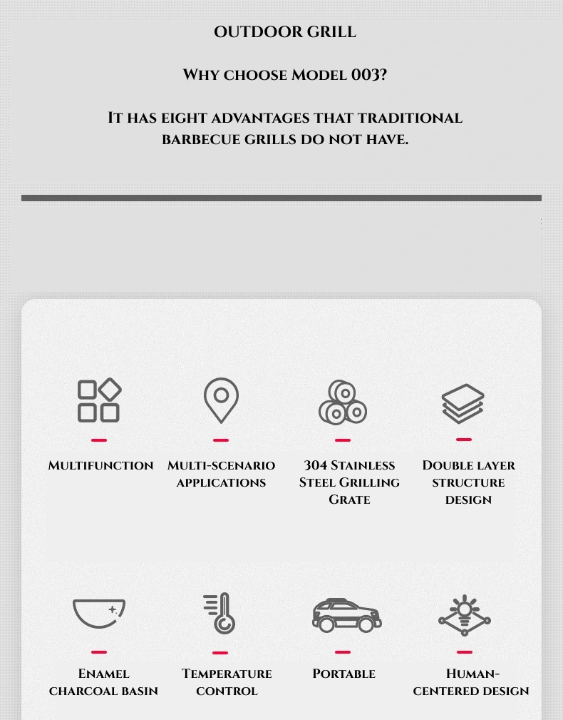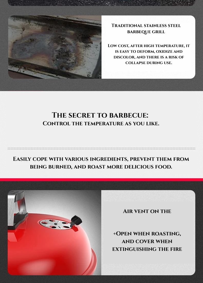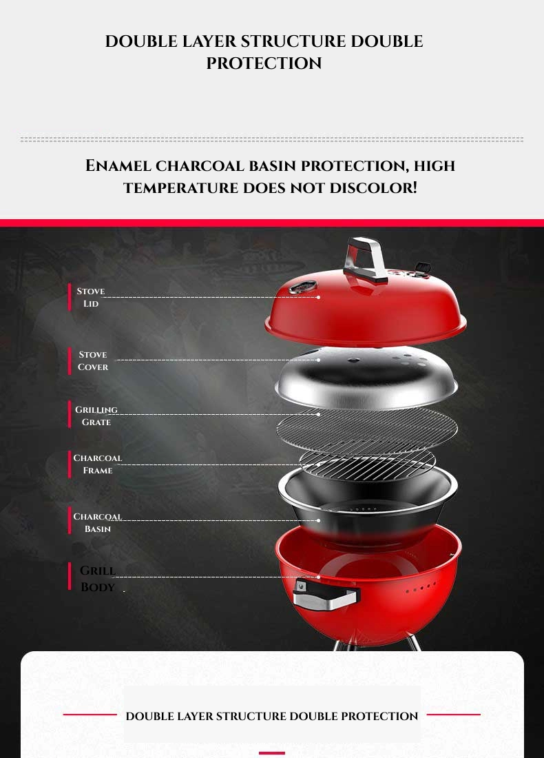 Material: 304 stainless steel grilling grate, thickened steel plate, enamel charcoal basin